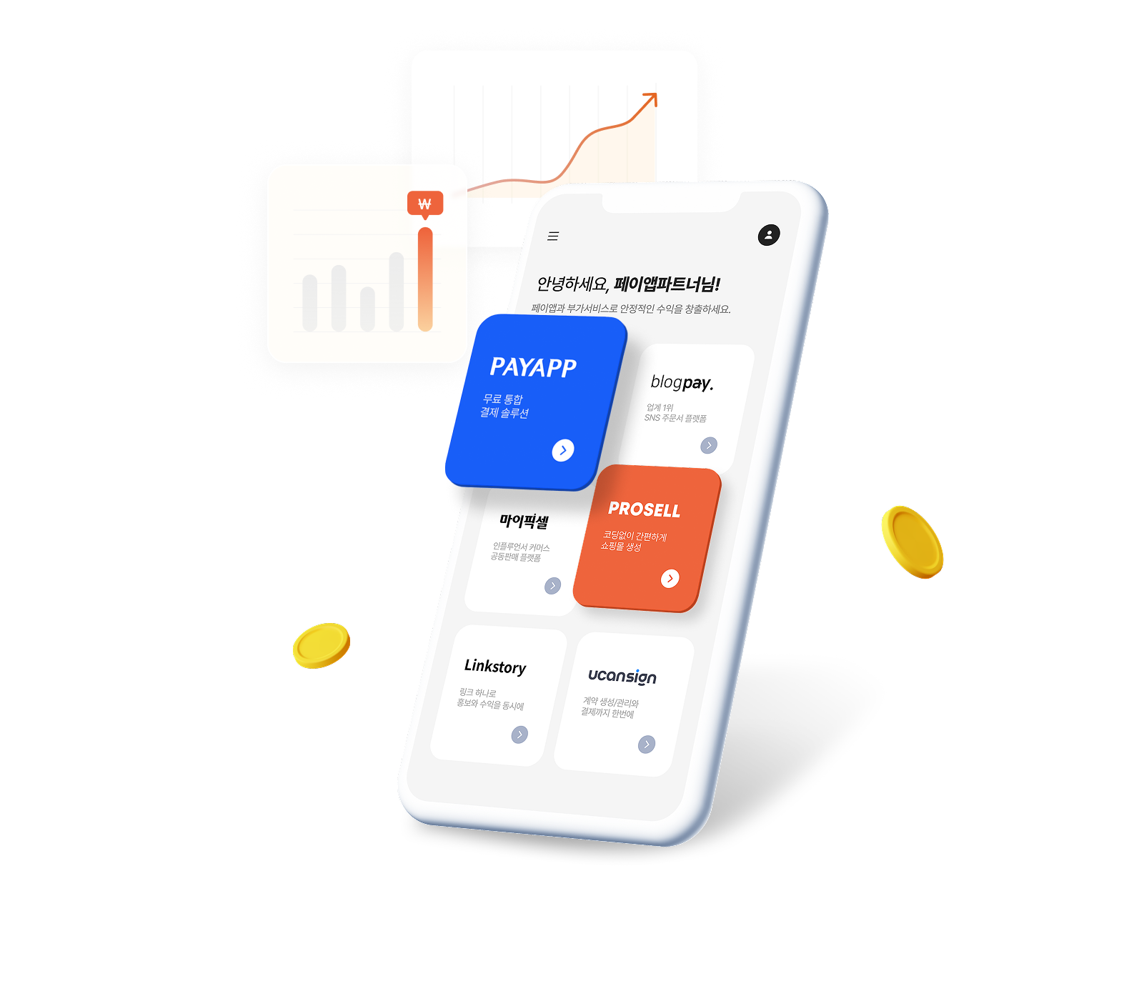 페이앱과 함께, 블로그페이, 프로셀, 마이픽셀, 유캔싸인, 링크스토리 등 페이앱의 다양한 응용/부가 서비스까지 함께 영업 가능